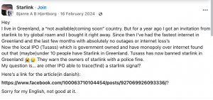 Already, after the 2024 ban was instituted, one Greenlander publicly complained to the 375,000-member Starlink Facebook group: