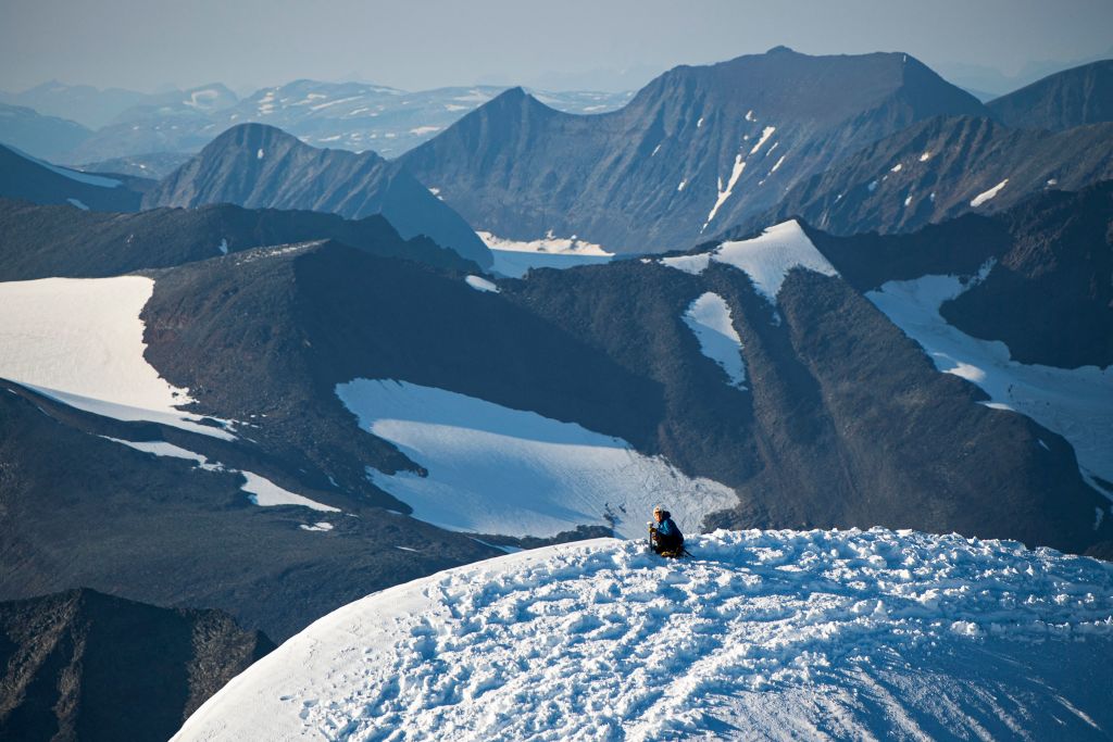 A researcher at the peak of the southern summit of Kebnekaise in northern Sweden. Kebnekaise is home to Sweden’s two highest peaks. The southern summit, which was the tallest, has shrunk as the glacier at its top is melting. (Jonathan Nackstrand/AFP via Getty Images)
