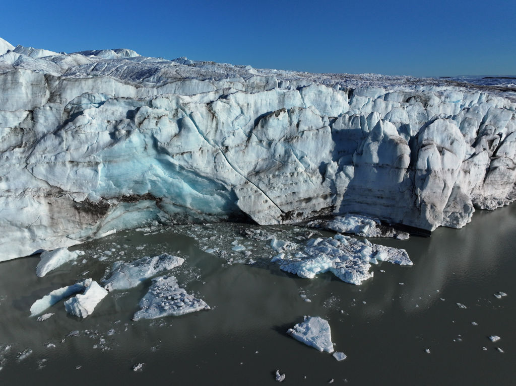 A 2024 aerial view the Russell Glacier, which descends from the Greenland Ice Sheet, near Kangerlussuaq, Greenland. The Greenland Ice Sheet lost an estimated 129 billion tons of ice in 2025. (Sean Gallup/Getty Images)