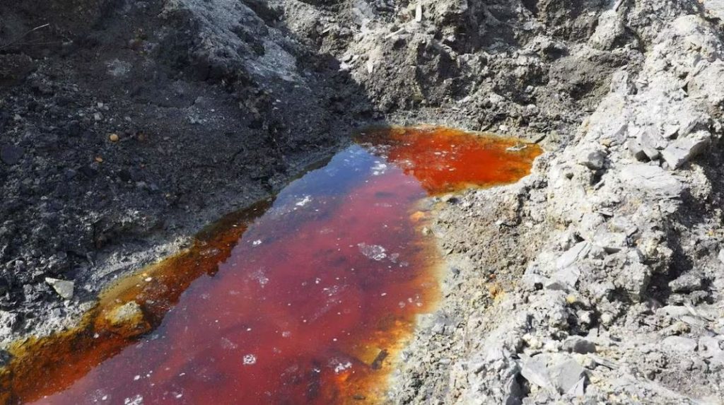 L’infiltration de cette solution acide riche en métaux, notamment le fer libéré par l’oxydation de la pyrite, provoque le phénomène connu sous le nom de « la rouille » des rivières.