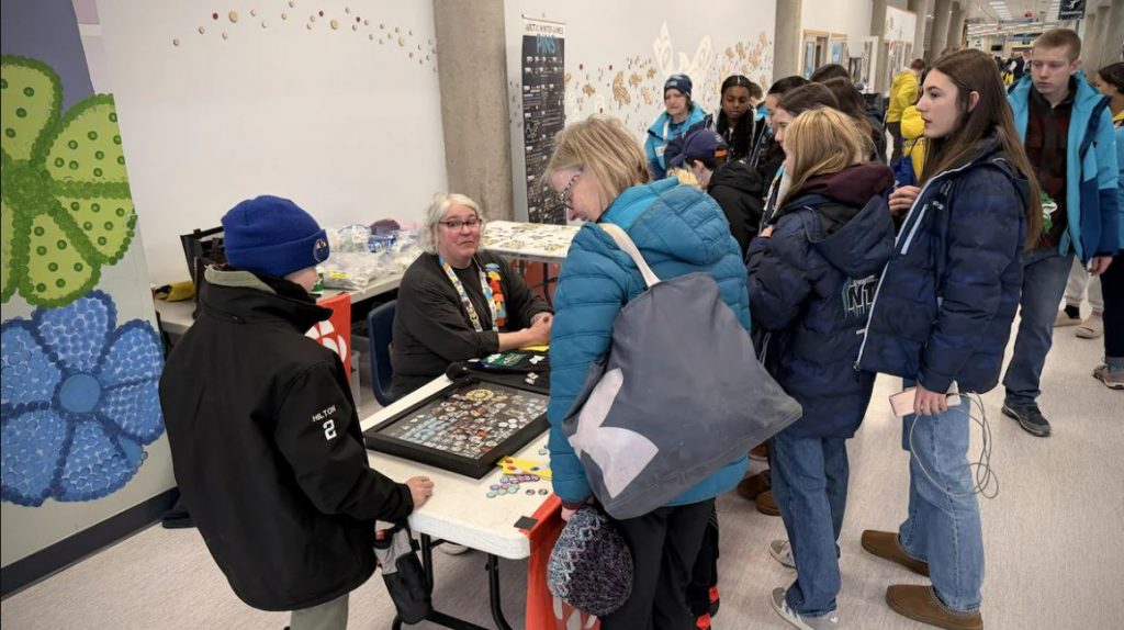 Les cris et les applaudissements fusent de partout au Centre des Jeux du Canada, à Whitehorse. Pendant que les jeunes athlètes des Jeux d’hiver de l’Arctique se dépassent dans une multitude de disciplines sportives, un autre sport, non officiel et bien particulier, se pratique en périphérie : la chasse aux épinglettes.